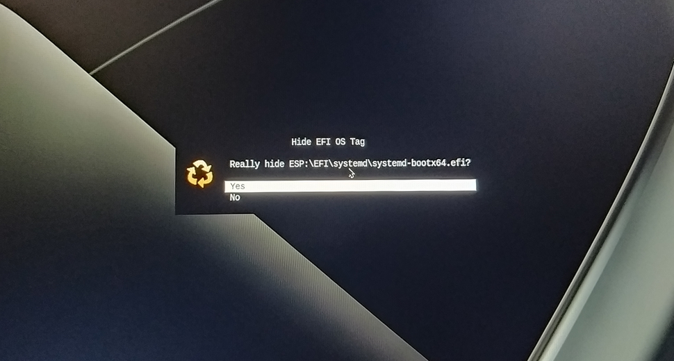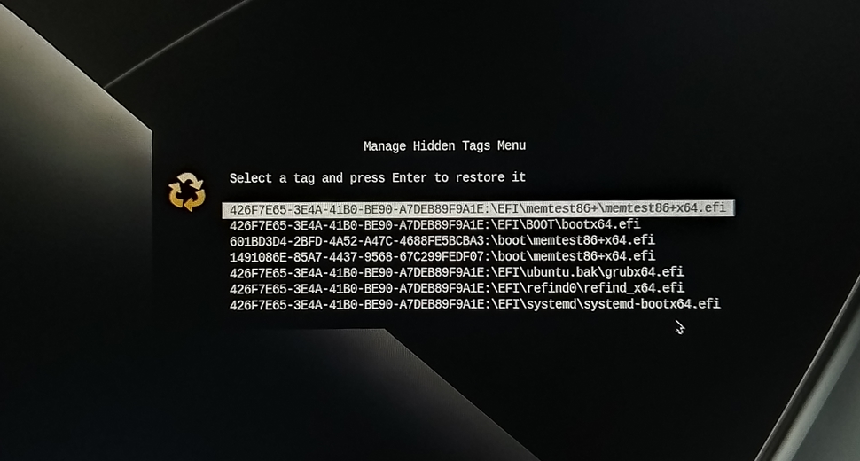 Allez, elle est pas lisible ma foto ci-dessus ? Faudra changer tes lunettes... mais bon, j'ai réussi à progresser sur les tags et autres show-tools, mais j'arrive toujours pas à virer le tag "Lesieur". Et pourtant j'ai utilisé 2 des méthodes préconisées cad pointer sur le tag à supprimer et puis simplement appuyer sur la touche "suppr", ou en allant dans /boot/efi pour renommer bkpbootx64.efi en bkpbootx64.efiold, rien à faire "Lesieur" resiste, bien qu'avec un comportement légèrement différent, cad il plante plus, il affiche une ou deux lignes et revient immediatement sur l'écran rEFInd...