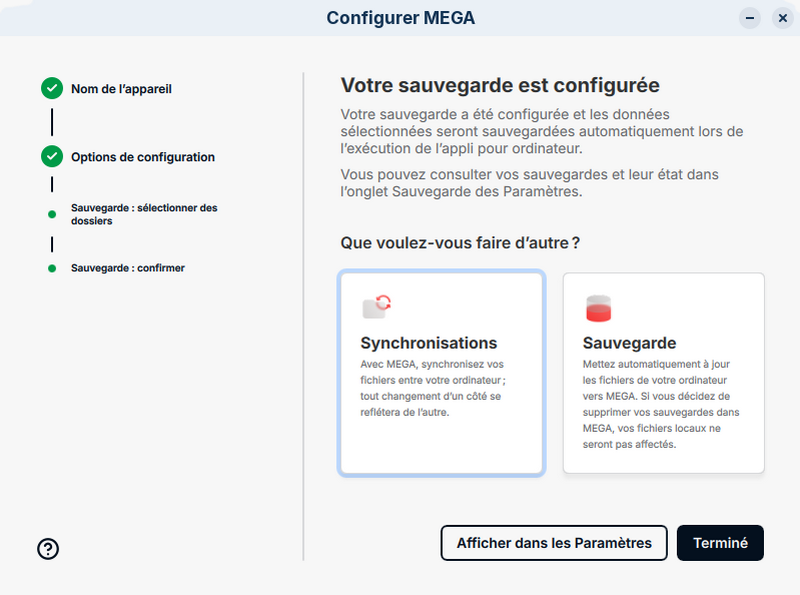 Lorsque vous le rouvrirez, l'intégration de Mega sera prise en compte, les répertoires synchronisés étant clairement identifiés