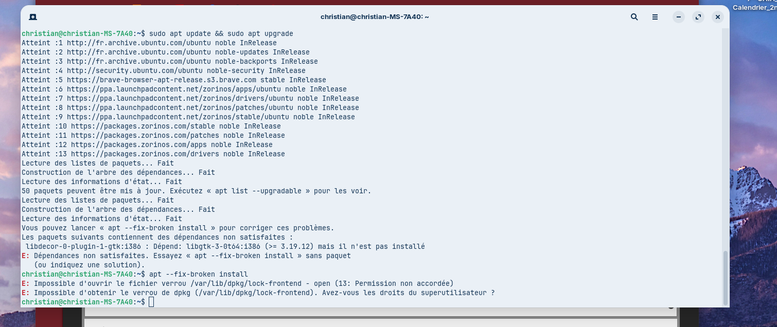 ChristianB a écrit : jeu. 11 déc. 2025 18:36 Apres avoir executé dans un terminal la commande sudo apt-get install -f