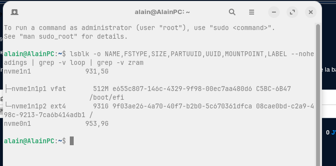 alain@AlainPC:~$ lsblk -o NAME,FSTYPE,SIZE,PARTUUID,UUID,MOUNTPOINT,LABEL --noheadings | grep -v loop | grep -v zram