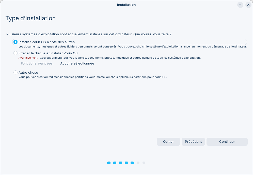 • Ensuite, choisis "Installer Zorin à côté des autres" et laisse le processus aller jusqu'au bout :