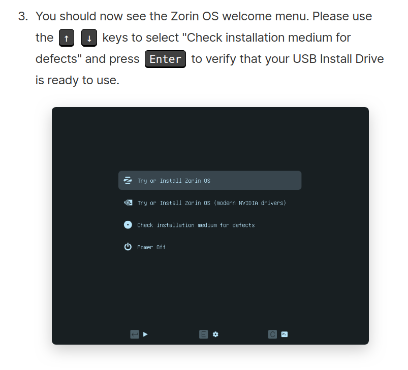 En gros le scénario est : je boot sur la clef, si j'attends et peu importe que je sélectionne 'Try or install Zorin' en 'safe mode' ou non, ou que je souhaite juste lancer le 'check', la seconde d'après : écran noir, même si j'attends 1h.
