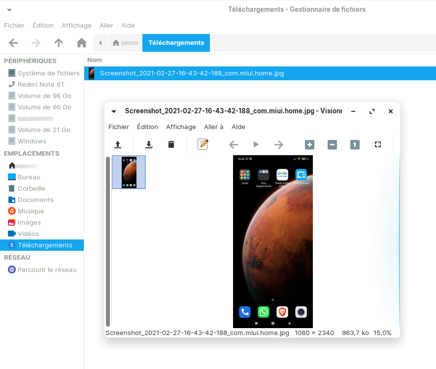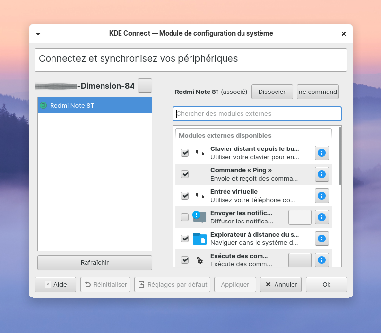 - J'ai installé KDE Connect à la fois sur mon ordi et sur mon portable (Xiaomi Redmi Note 8t).