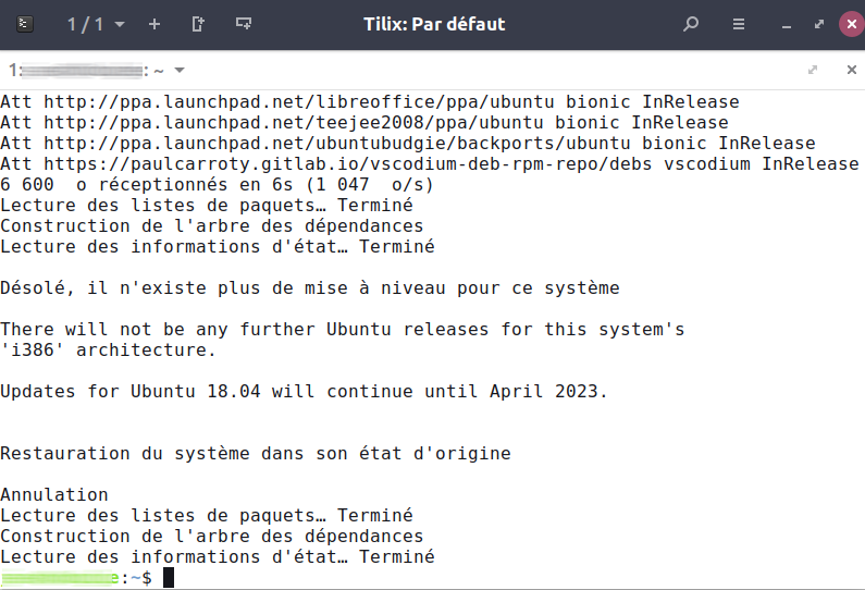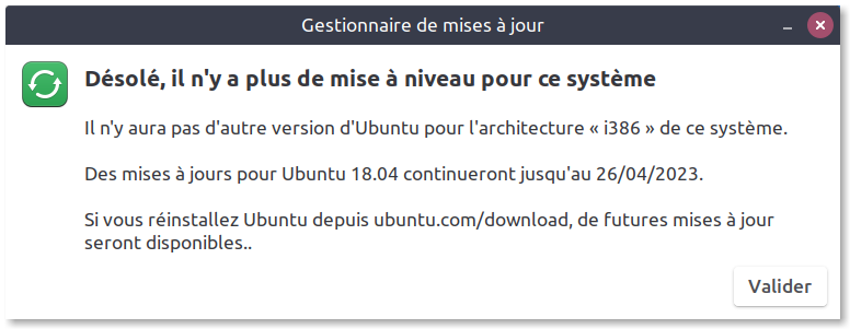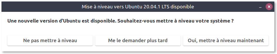 Hier, j'ai eu un drôle de message du gestionnaire de mises à jour, qui me proposait une mise à niveau vers Ubuntu 20.04. N'ayant pas le temps — et pas très envie de prendre des risques, j'ai différé.