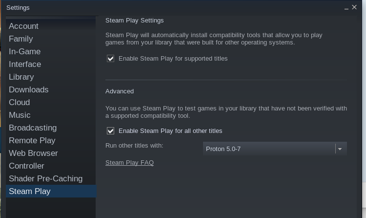Vous devez utiliser la version Steam Proton recommandé par Steam : Proton 5.0-7. Il s'agit de la version la plus stable de Steam Proton à la date d’aujourd’hui.