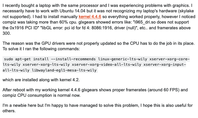 J'ai récemment acheté un ordinateur portable avec le même processeur et je rencontrais des problèmes graphiques. Je dois nécessairement travailler avec Ubuntu 14.04 mais cela ne reconnaissait pas le matériel de mon ordinateur portable (skylake non pris en charge). Je devais installer manuellement le noyau 4.4.6 pour que tout fonctionne correctement. Cependant, j'ai remarqué que compiz prenait plus de 60% du processeur. glxgears a affiché des erreurs telles que: "i965_dri.so ne prend pas en charge l’ID PCI 0x1916" "erreur libGL: ID pci pour fd 4: 8086: 1916, pilote (null)", etc. et dépassement de 300.