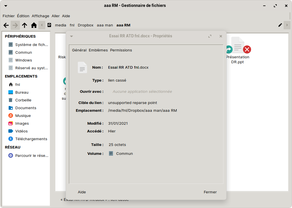 Avec Zorin, le gestionnaire de fichier ouvre bien cette partition et je peux naviguer sans problème dans tous les répertoires et sous répertoires. Par contre, si je vois bien les fichiers contenus dans ces répertoires je ne peux en ouvrir aucun. Ils sont tous affichés avec une croix dans un cercle rouge et je vois "broken link" dans les propriétés.