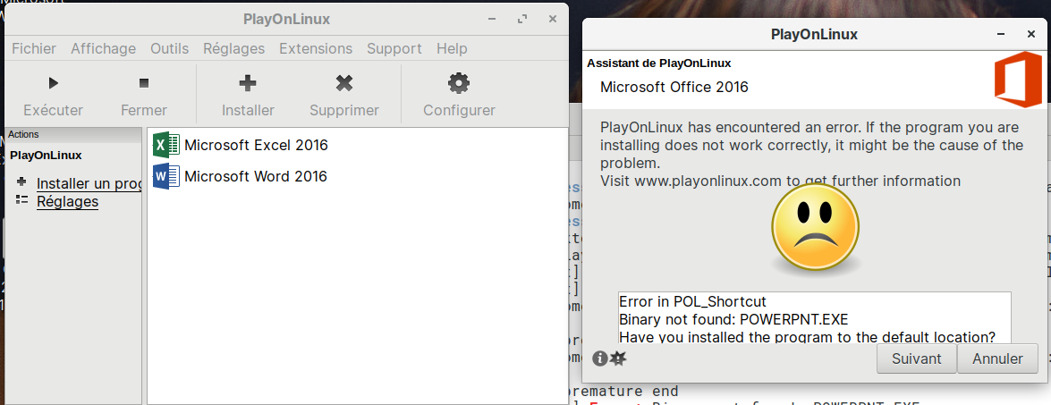 Je n'utilise plus PlayOnLinux qui est souvent source de problèmes alors que Wine fait très bien les choses par lui-même pour l'usage que j'en ai. Je l'ai même désinstallé.