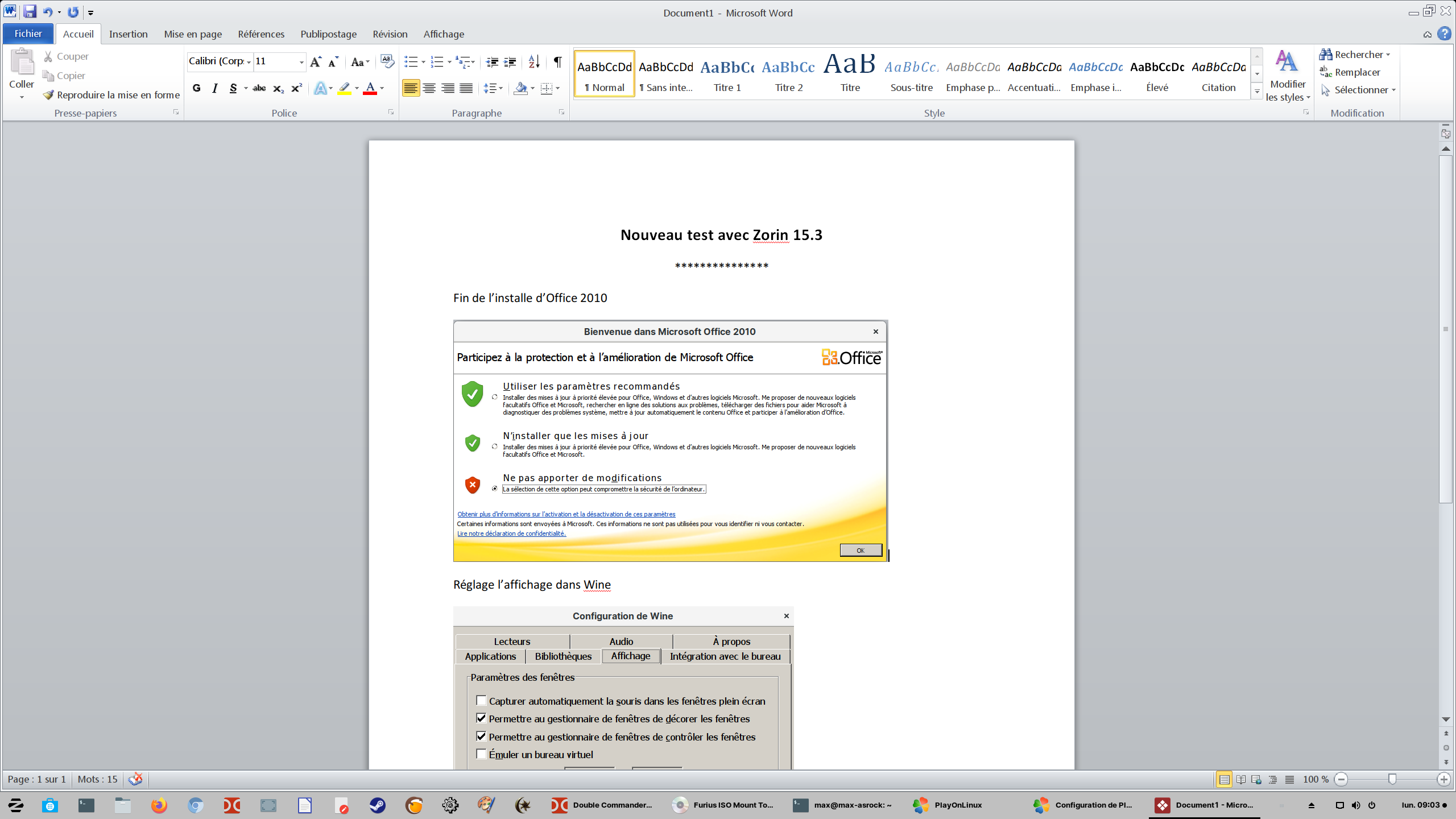 A priori Office 2010 fonctionne correctement sur Mint 20, dès que possible je vais refaire une installation propre sur Zorin, mais avec Office 2016, c'est mission impossible !