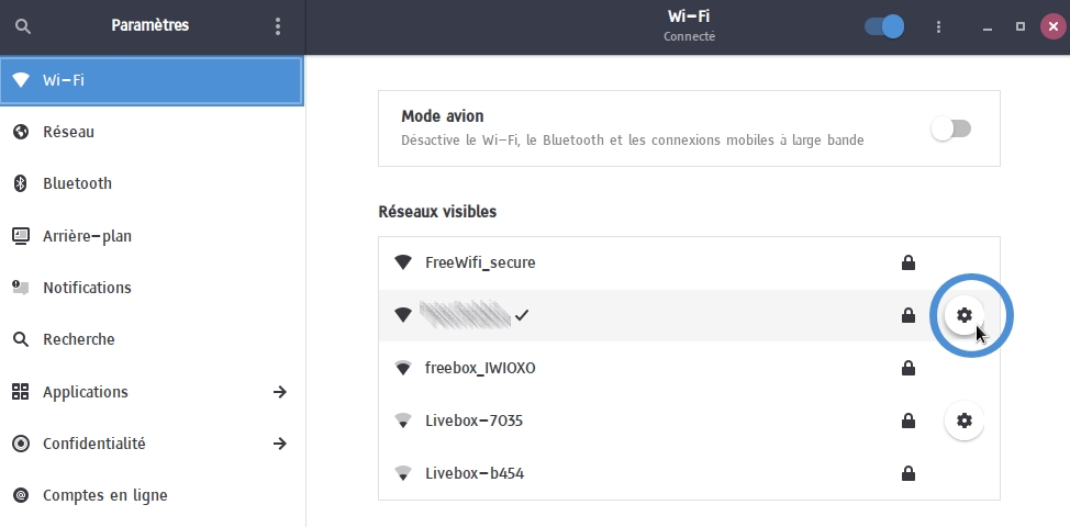 Dans les paramètres, clique sur "Wi-fi", puis sur les paramètres du réseau :
