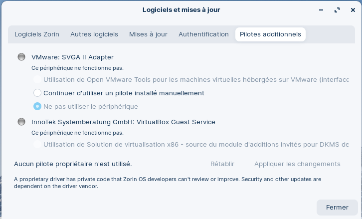 Ensuite pour ta question concernant les pilotes, non ils n'ont rien à voir avec ceux de windows, je ne sais plus quelle version de zorin tu as, mais tu peux vérifier assez simplement si les bons drivers sont installés sur ta machine dans le menu zorin "Outils système" et "Pilotes additionnels", normalement tu devrais tomber sur quelque chose de ce style :