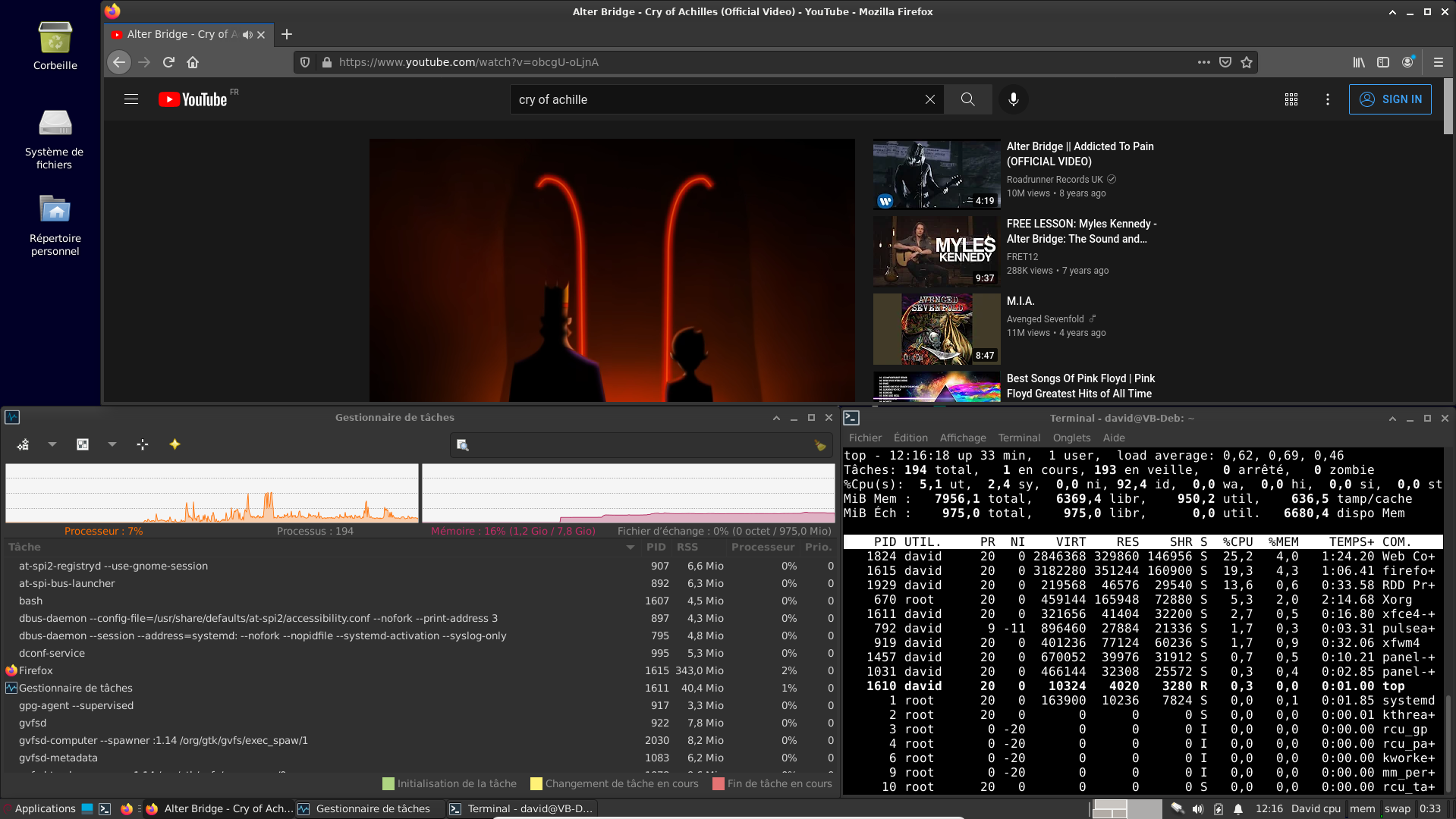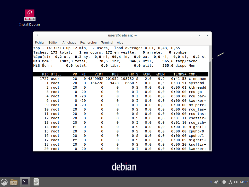 Une autre capture d'écran de Deb Cinnamon, avec "top" et le moniteur ressources en parallèle.