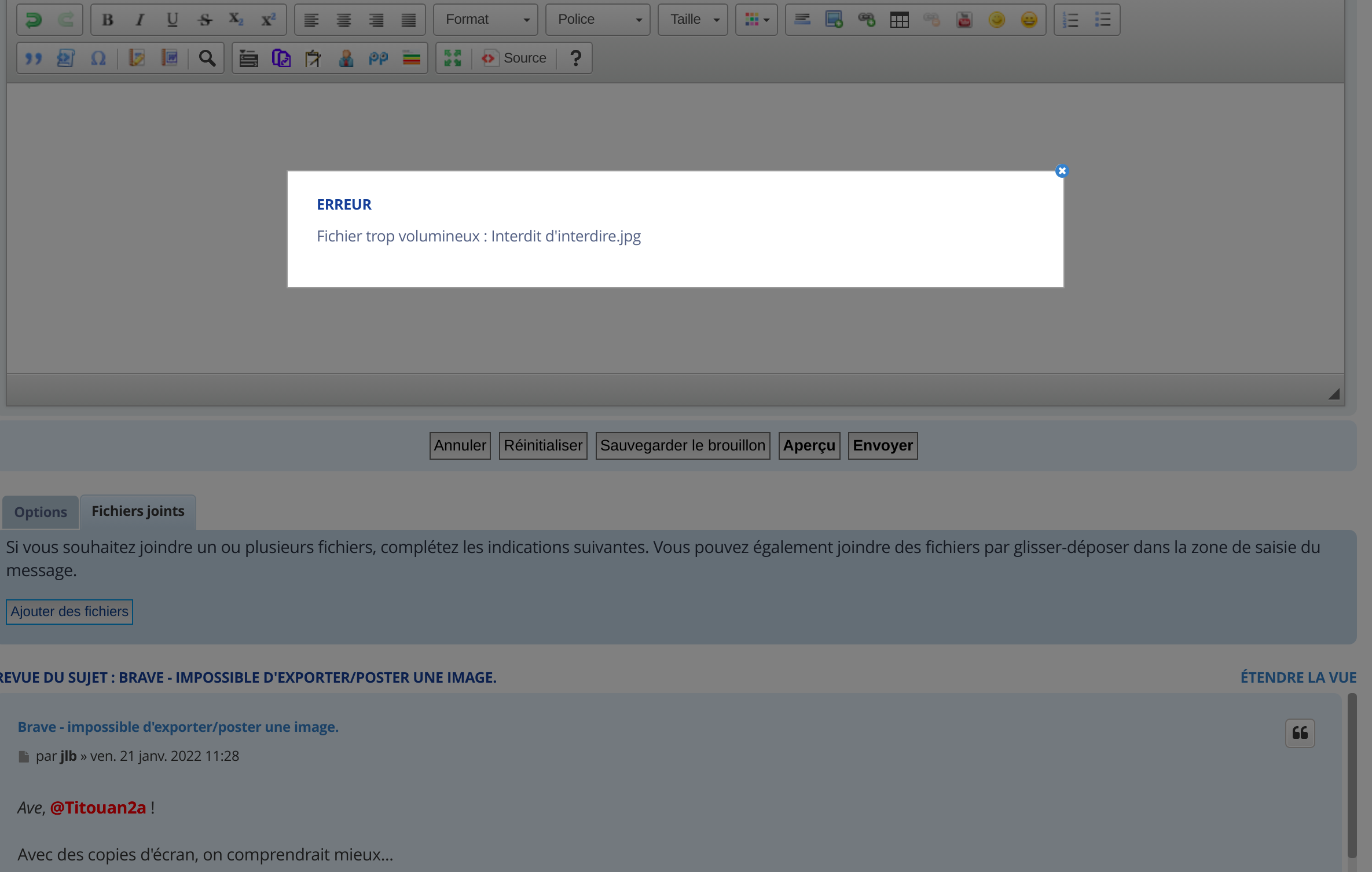 Avec le navigateur brave, quand je veux exporter une image pour la poster vers un forum ou FB... Pas moyen! ça indique un fichier trop volumineux sur les forums (ça le fait ici) même s'il est minus, et ça mouline sans fin chez FB sur l'affichage de l'aperçu, qui ne vient jamais... Ceci où que soit la source, sur n'importe quelle partition de mon DD, même la partoche système.