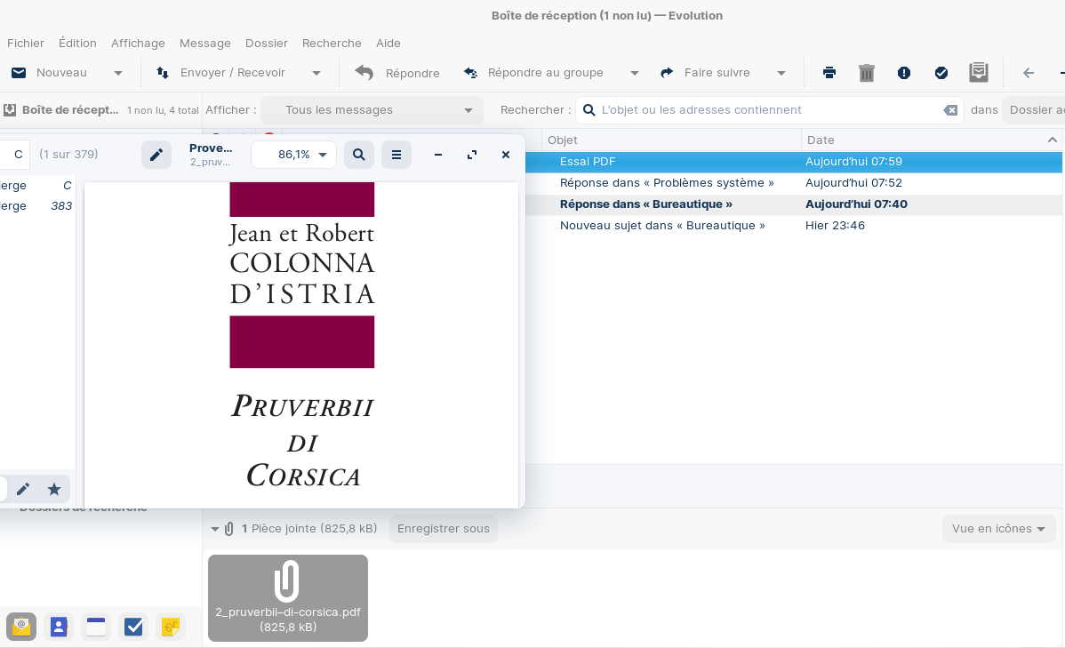 J'utilise évolution depuis janvier que je suis passé à Zorin et les pj s'ouvrent depuis le départ d'un simple double clic si j'ai le logiciel ad hoc, capitaine!