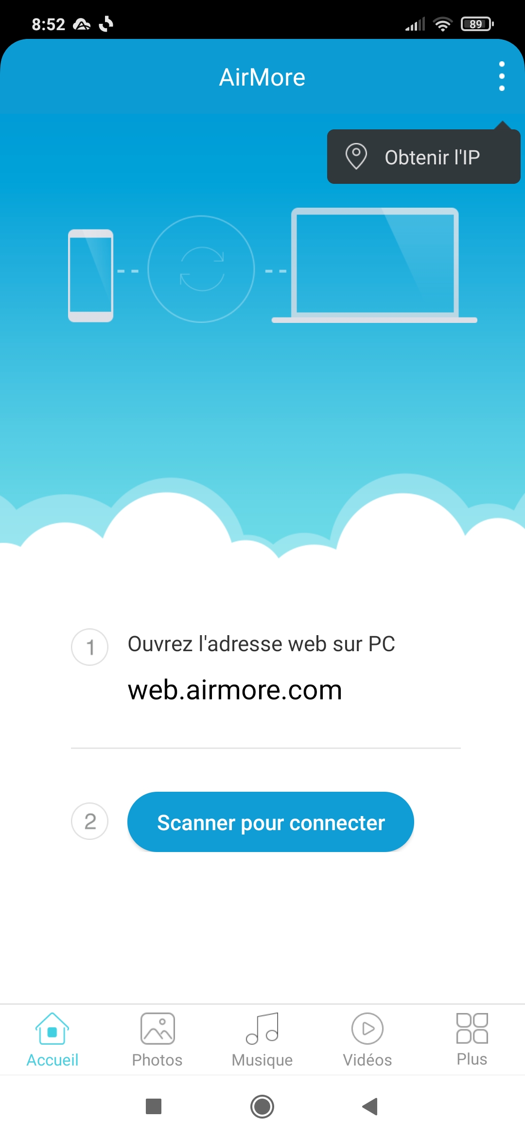 Utilisez l’application AirMore sur votre Smartphone Android pour scanner le code QR. Votre Android et votre PC doivent-être relié au même Wifi.