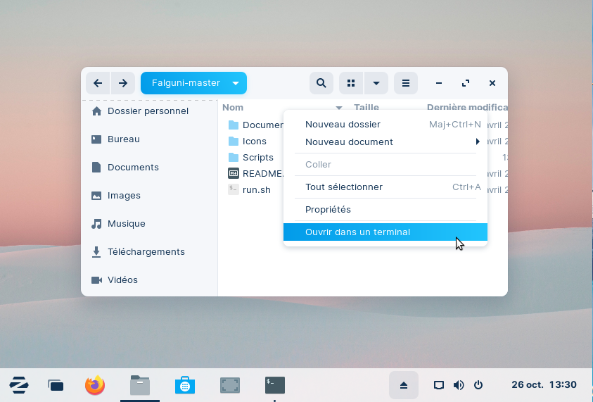 • Cliquez droit sur une zone vierge et choisissez "Ouvrir dans un terminal" :