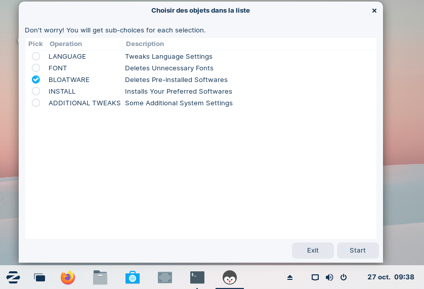 Le script, en mode graphique, commence par mettre votre système à jour, ce qui n'est pas sot : même si vous devez par la suite supprimer un certain nombre d'applications, il ne sait pas lesquelles.