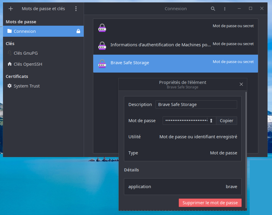 Contrairement à ce que j'avais constaté il y a un an, il me semble que les entrées de Brave/Chrome ne se recréent pas si on n'établit pas de mot de passe au lancement du système. Effet d'une nouvelle version de l'appli (14.0-2) et/ou d'Ubuntu 22.04.1 sur lequel j'ai fait mes essais ? Il faudrait voir sur le long terme...