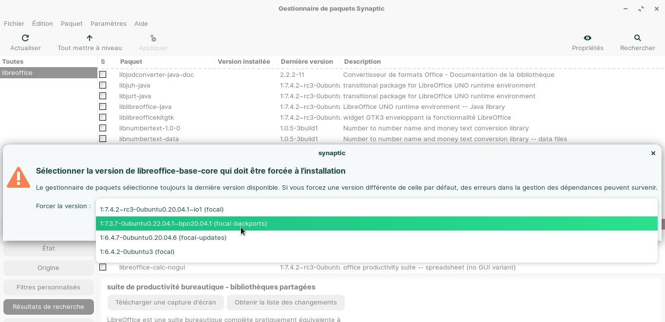 Je n'ai pas trouvé le moyen de downgrader, donc je supprime libreOffice et je réinstalle à la main. Tout marche sauf que je récupère une version en anglais. Mais bon par contre plus de problème.