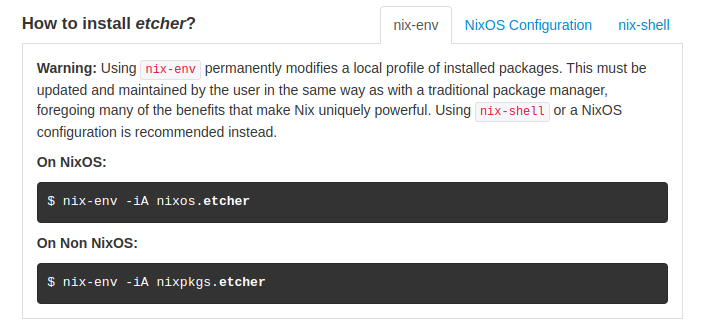 • La seconde méthode ("NixOS configuration"), est la plus exotique, mais c'est celle qui permet de bénéficier des avantages conceptuels de Nix et d'assurer la fiabilité et la reproductibilité de votre système.