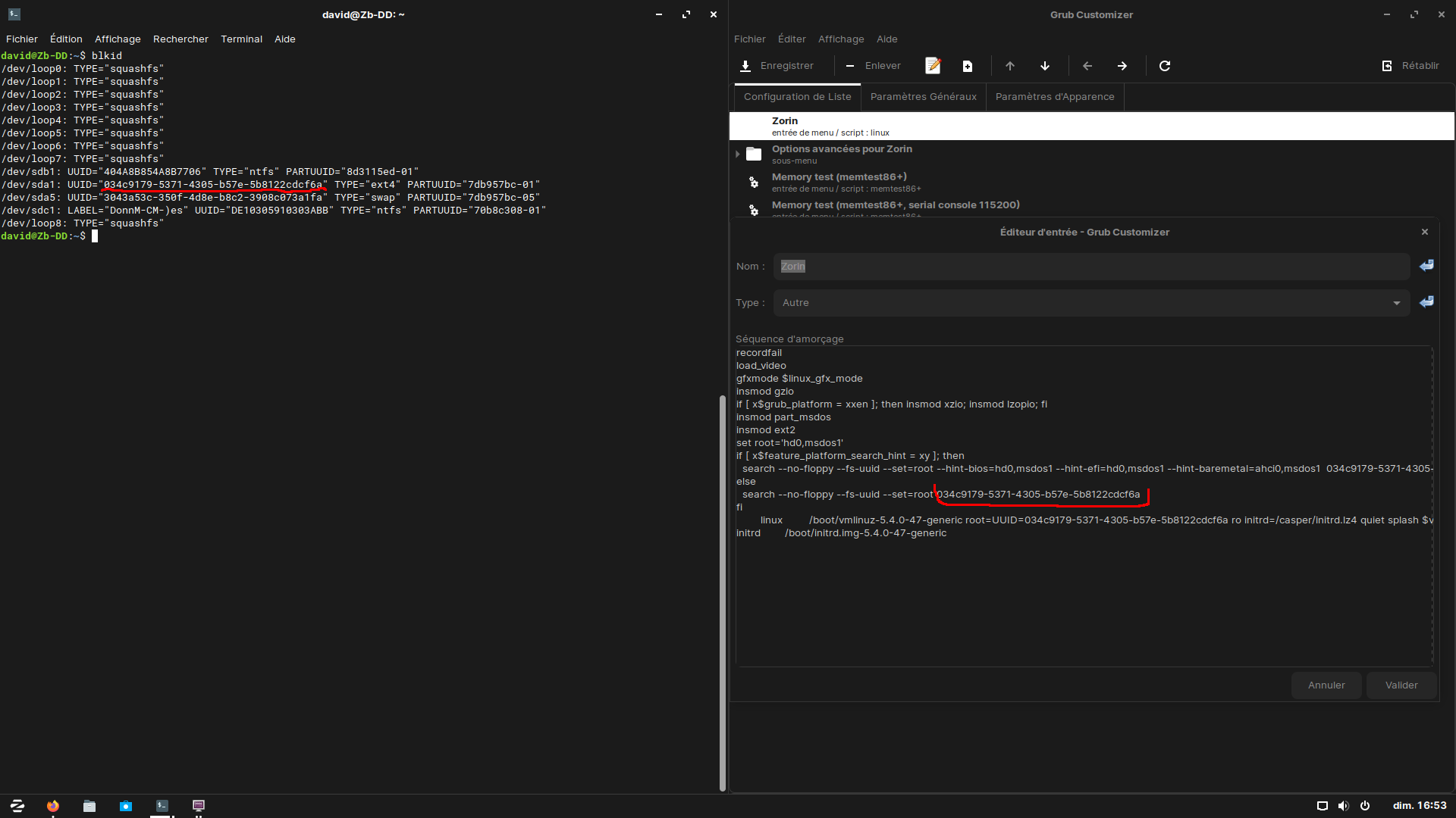 Maintenant revenons au fond du problème de mon install qui n'a pas bougé d'un poil, @Jlb m'a orienté vers un souci avec grub sur l'uuid qui pourrait ne pas être correcte, j'ai donc vérifié cette dernière et j'ai bien la même dans le fichier de config de grub que dans mon terminal pour la localisation de Zorin.