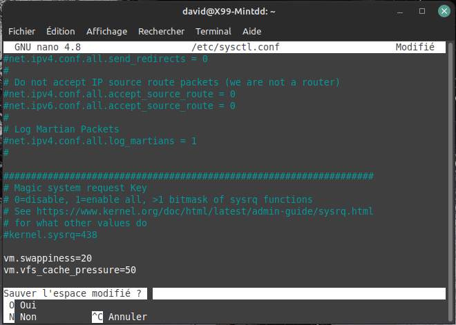 sudo nano /etc/sysctl.confTu rajoutes tes deux lignes tout en bas de ton fichier.