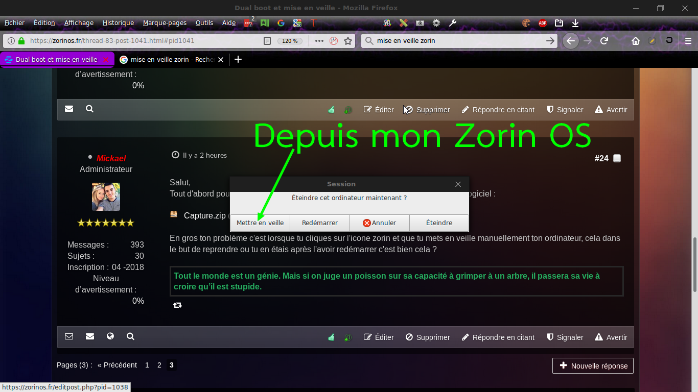 Conclusion, chez moi la mise en veille fonctionne bien depuis Zorin OS dans sa toute première mouture. Aucun bugs à signaler de ce coté là pour ma part.