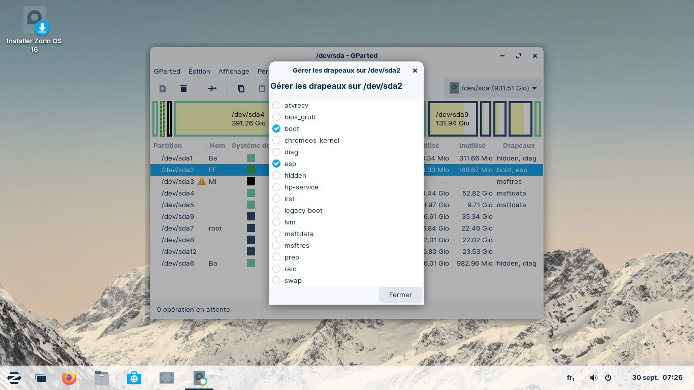 Précision, j'ai fait ça a partir de la version "USB" de Zorin (en mode "essayer/installer")