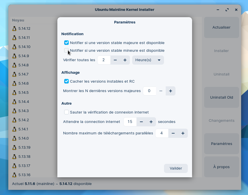 NB : Mainline est aussi un outil de veille. Pour ne pas être dérangé par les notifications à chaque nouvelle version du kernel, décoche quelques cases dans ses préférences. Celle-ci en premier :