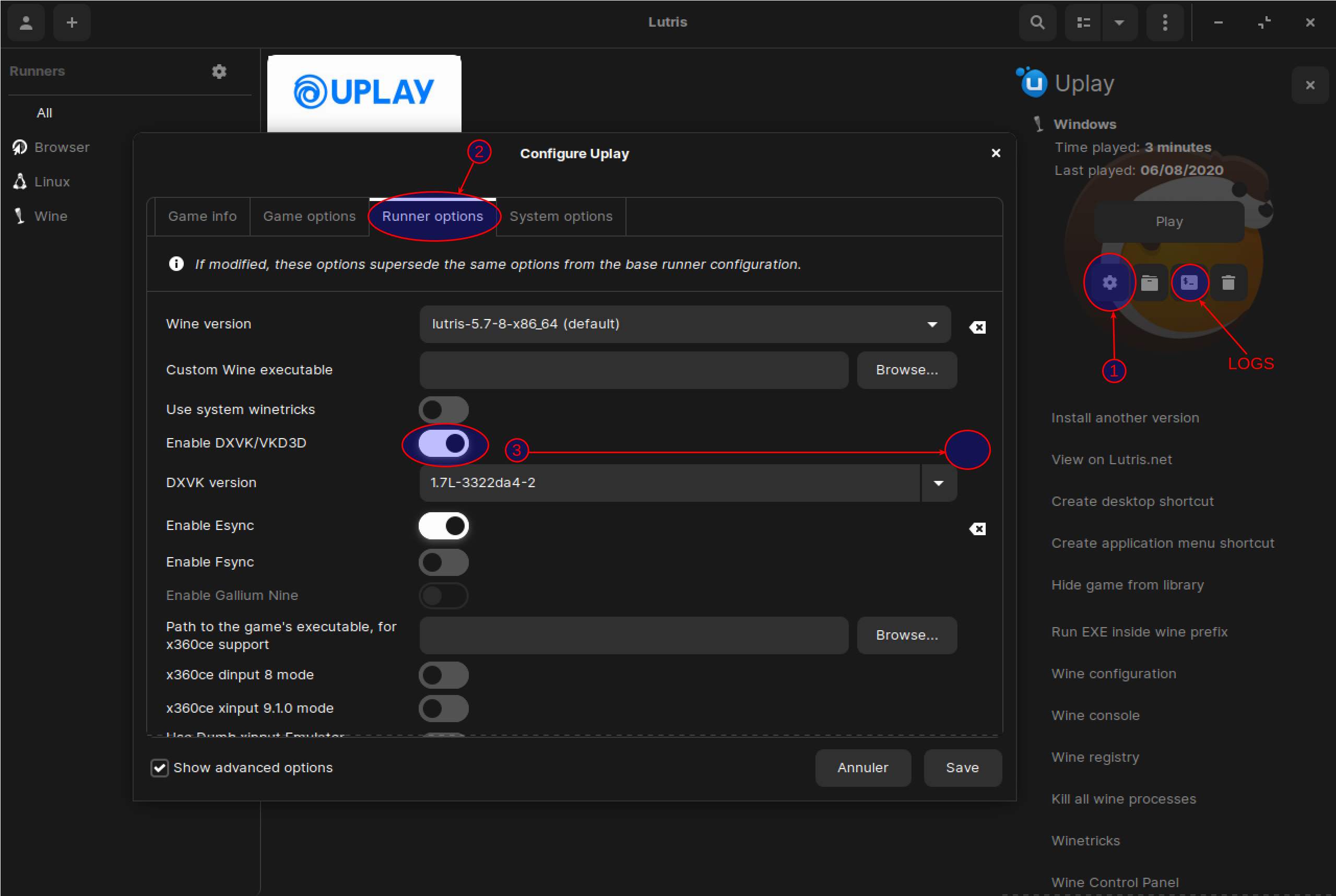 Normalement Uplay doit se lancer mais il se peut qu'un 2e message d'erreur apparaît concernant DXVK (toujours en rapport avec Vulkan). Vous pouvez aussi aller voir dans les logs via l'icône juste avant la corbeille (avec un $).