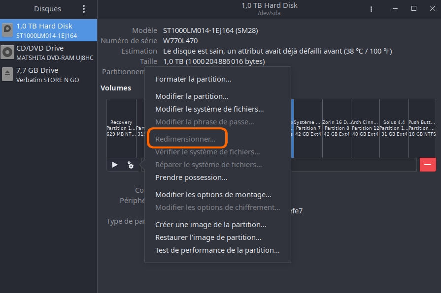 Non, ça ne fonctionne pas avec "disques" de Gnome. L'option Redimensionner n'apparait pas quand je sélectionne la partition.