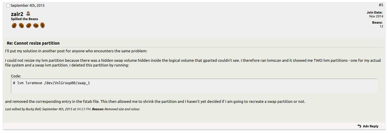 Pour Disques, je n'ai toujours pas la possibilité de procéder à un redimensionnement. Pour Gparted, Je n'ai qu'un simple ERREUR assez peu explicite, mais il propose un contre-rendu détaillé à enregistrer (ce que j'ai partagé dans ma dernière publication). Jusqu'ici, j'avais assez peu d'espoir de trouver une réponse à mon problème. Aucun n'article ou forum affirme que c'est possible de faire cohabiter des volumes logiques et des partitions sur le même disque. Mais aucun non plus n'affirme que c'est impossible !