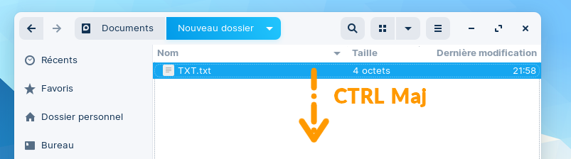 Je vais sur la partition Windows, je trouve mon fichier txt, j'appuie simultanément sur "control et maj" et je fais glisser, ben le fichier n’apparaît pas, il y a un effet ou je vois le fichier glisser vers la fenêtre active
