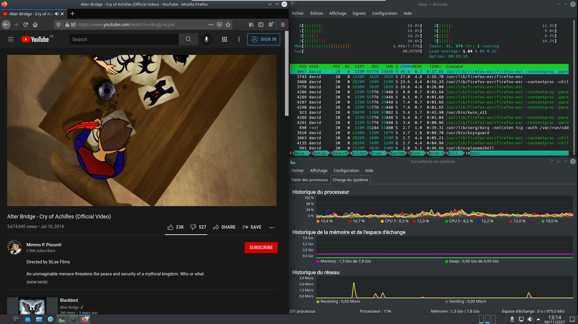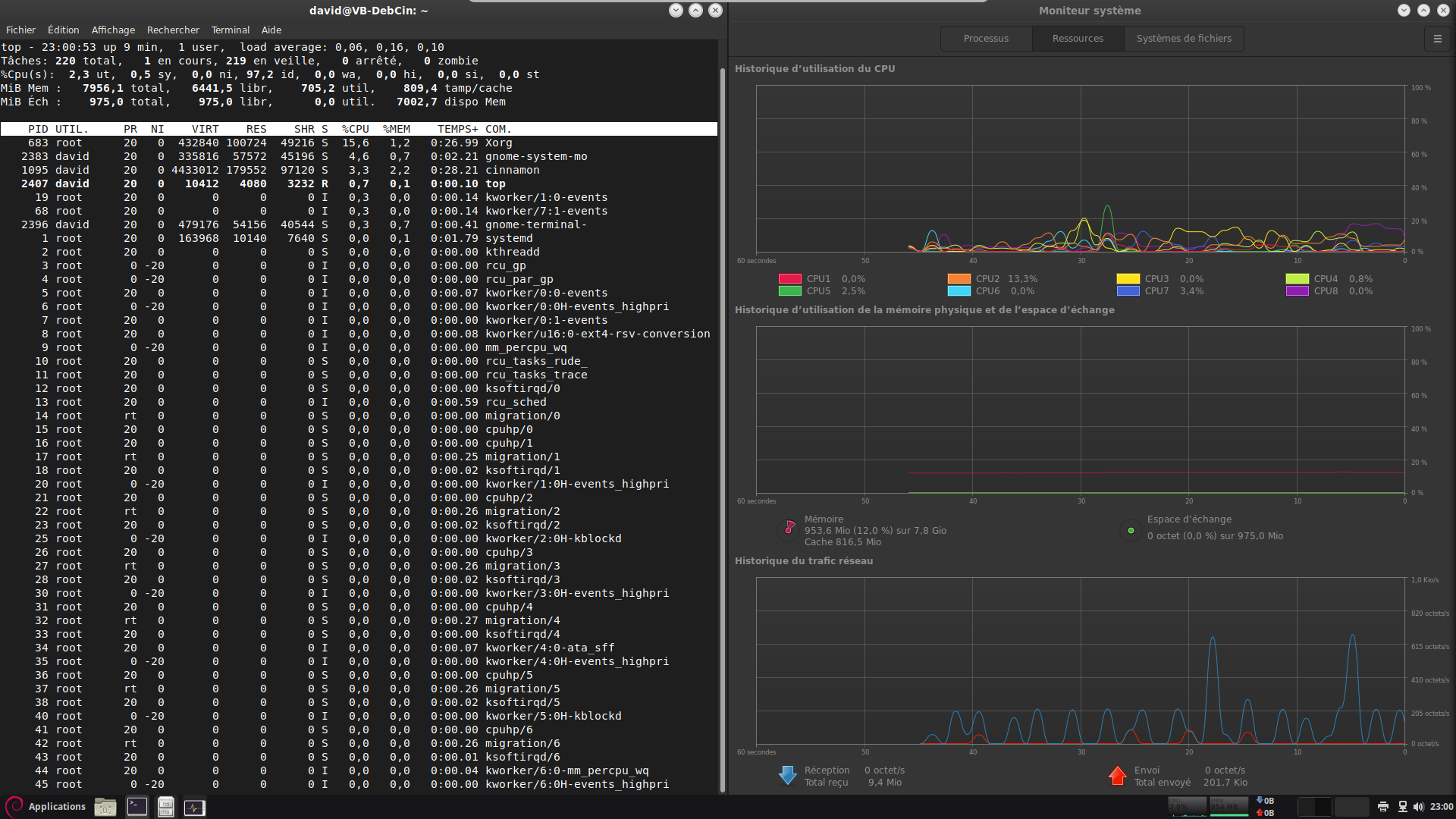 Une autre capture d'écran de Deb Cinnamon, avec "top" et le moniteur ressources en parallèle.