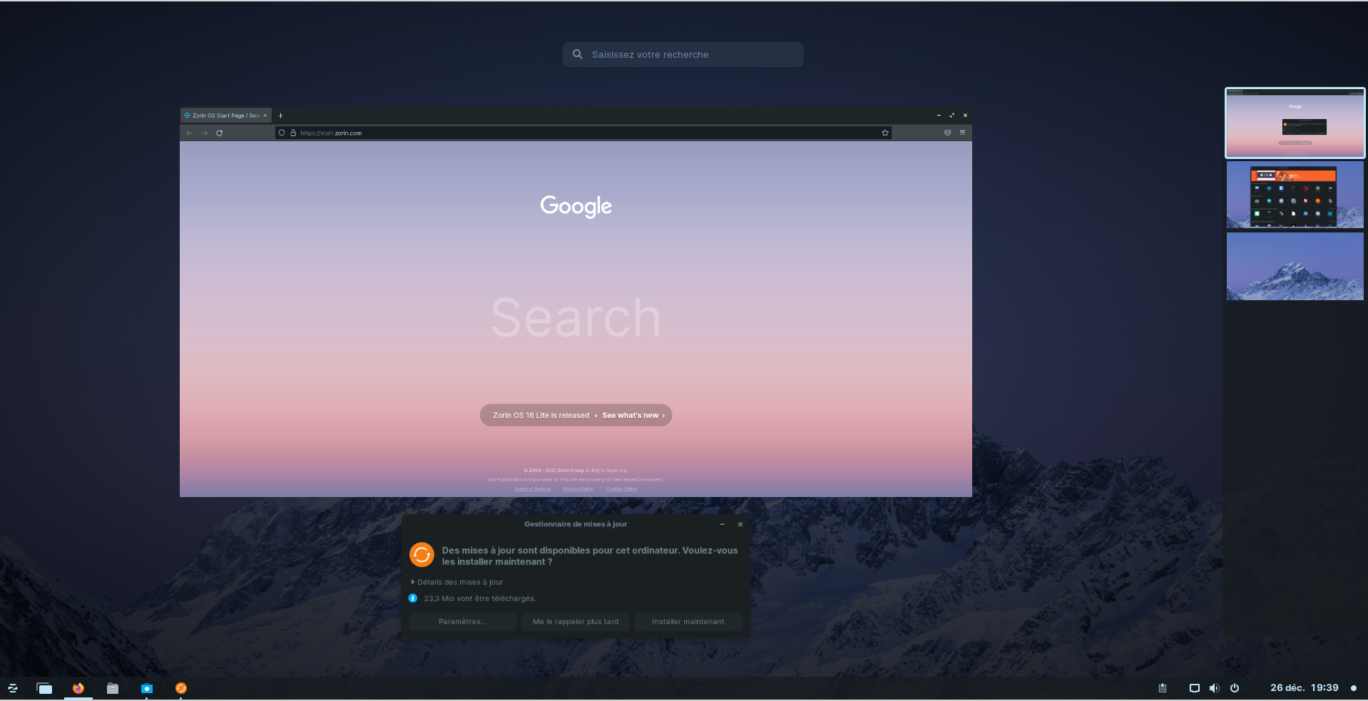 A compter du moment où l'on lance plus d'un logiciel à droite se crée un bureau supplémentaire. Et là il n'y a plus qu'à faire glisser la fenêtre de son choix dans le deuxième bureau, ce qui a pour conséquence immédiate d'en créer un troisième :