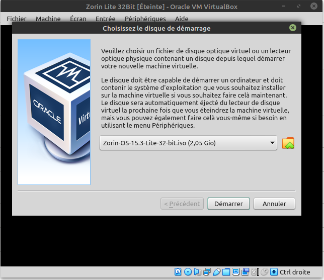 Maintenant il reste à démarrer et installer l'os (Zorin Lite) sur notre Machine Virtuelle toute neuve !