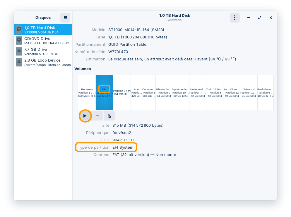 - Repérez la partition "/EFI" et cliquez sur le bouton "Démarrer" pour la monter :