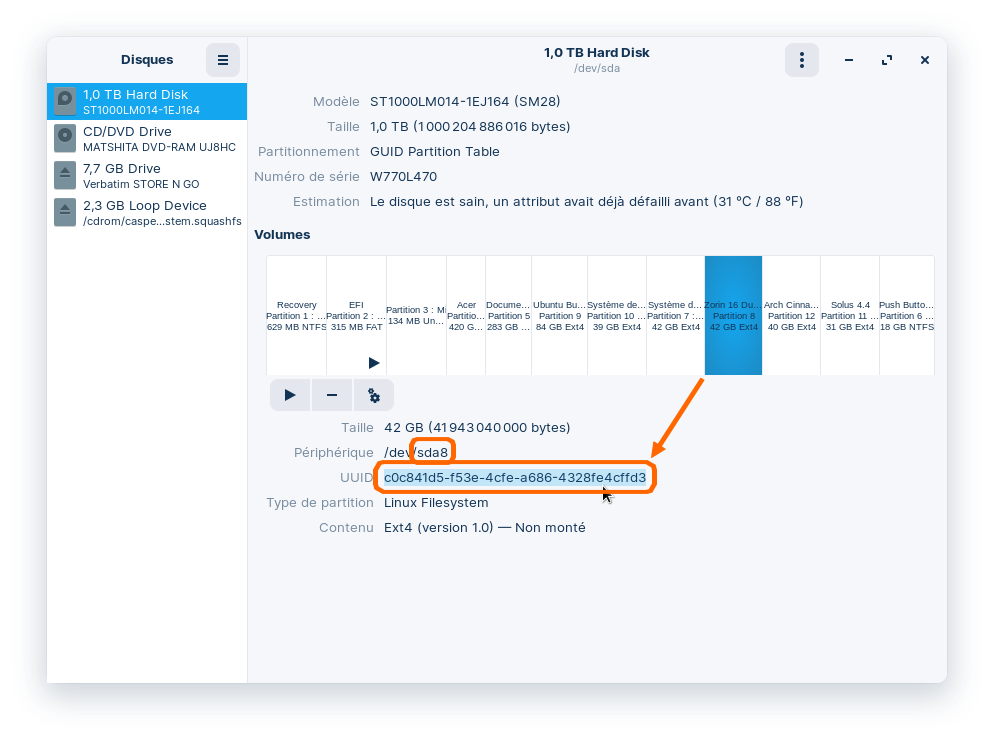 - Sélectionnez la partition sur laquelle vous voulez pouvoir démarrer (Zorin, dans mon cas), copiez son UIDD (Surlignez-la > Clic droit > Copier) et notez son numéro dans un coin de votre tête (8 dans mon multiboot) :