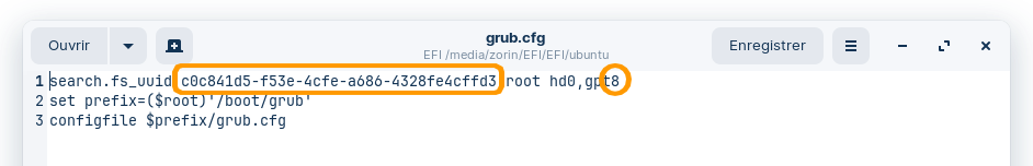 - Editez le fichier "grub.cfg" et remplacez l'UIDD de la partition par celle que vous avez copiée sans oublier de mofifier son numéro :