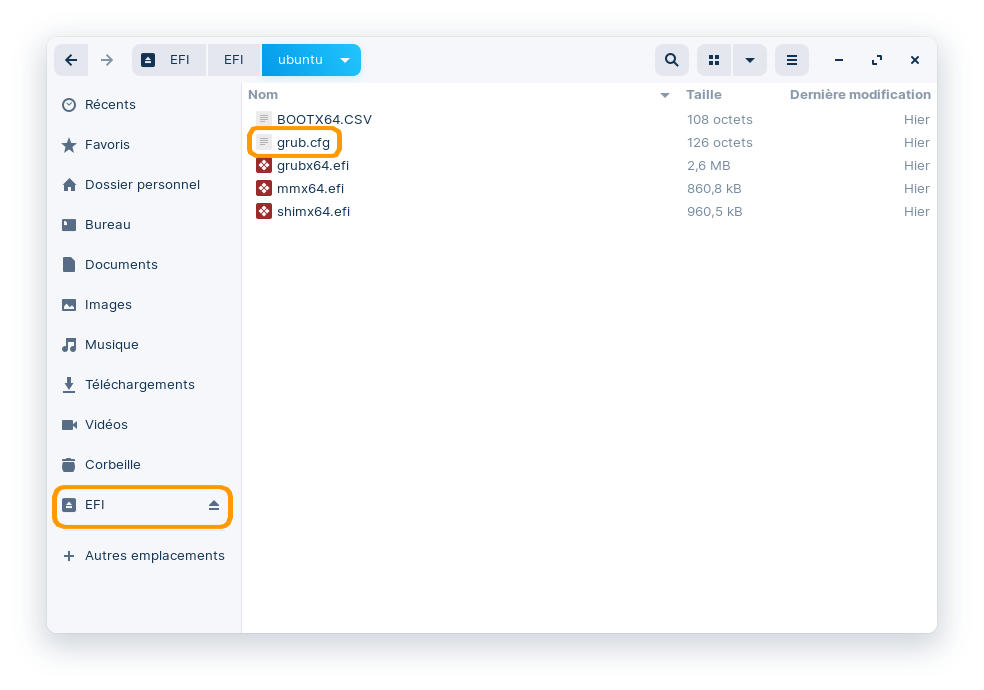 Comme la partition "EFI" est montée, elle est accessible depuis le volet latéral.