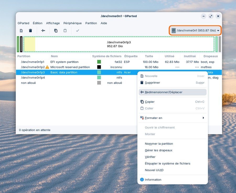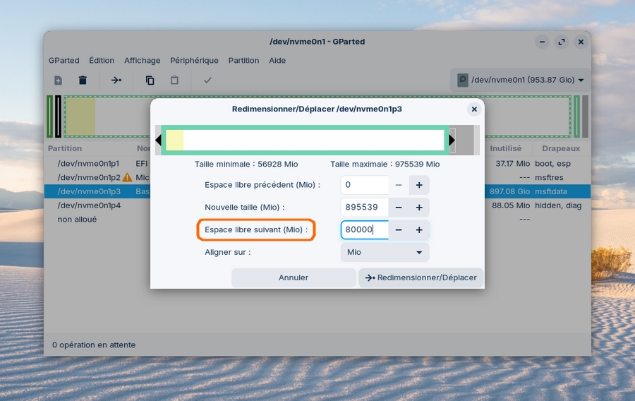 Important : Pour éviter des problèmes, redimensionnez toujours les partitions en partant de la droite pour ne pas modifier le point de montage — d'où la case "Espace libre suivant".