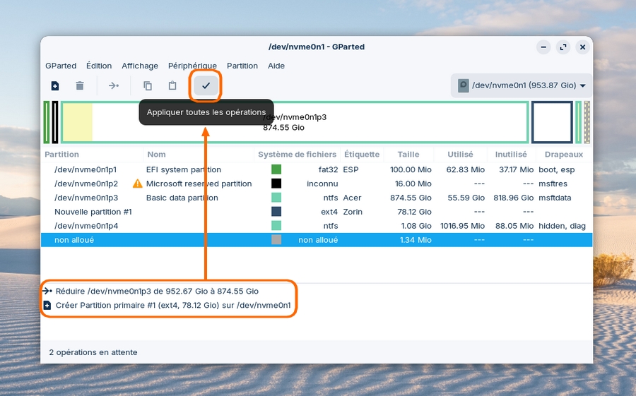 C'est là que nous allons récupérer de l'espace pour installer Zorin.