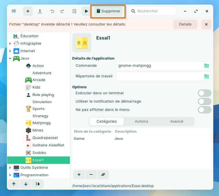 Mais si tu as supprimé le fichier ";desktop" dans le répertoire "/.local/share/applications", non seulement cela n'enlève pas le lanceur de la liste des applications du menu, mais cela rend inopérant le bouton "Supprimer" dans "Éditeur de menus".