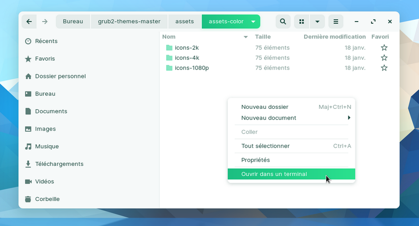 - Rendez-vous dans le répertoire "/assets/assets-color" de l'archive décompressée, cliquez droit et choisissez "Ouvrir dans un terminal" :