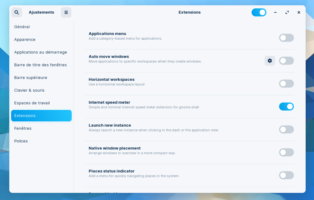 Je te conseille aussi d'installer l’application "Gnome-Tweaks" à partir du terminal (CTRL ALT t) pour gérer les extensions :
