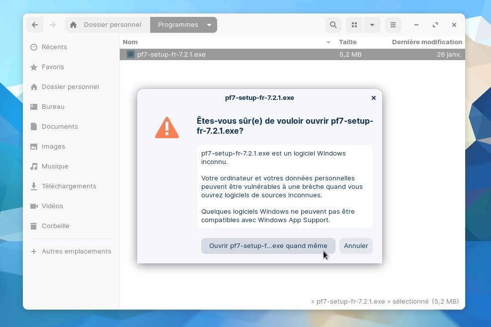 ​​​​​​​Quant à démarrer un exe, cela ne peut se faire qu’avec Wine, or il n'est pas installé.