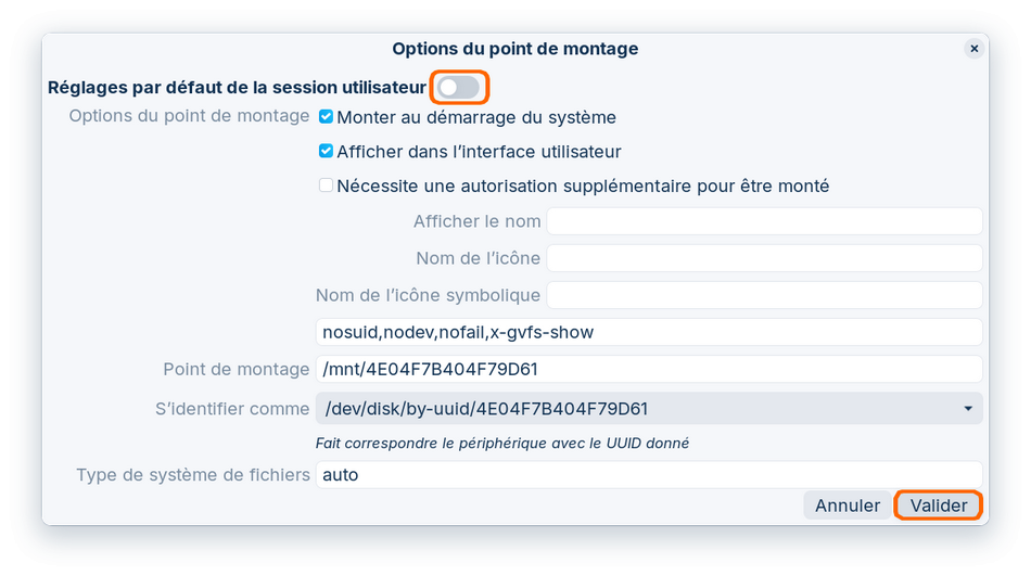 • Cliquez sur la partition NTFS, puis sur le petit engrenage placé en-dessous. Choisissez "Modifier les options de montage" dans le menu :