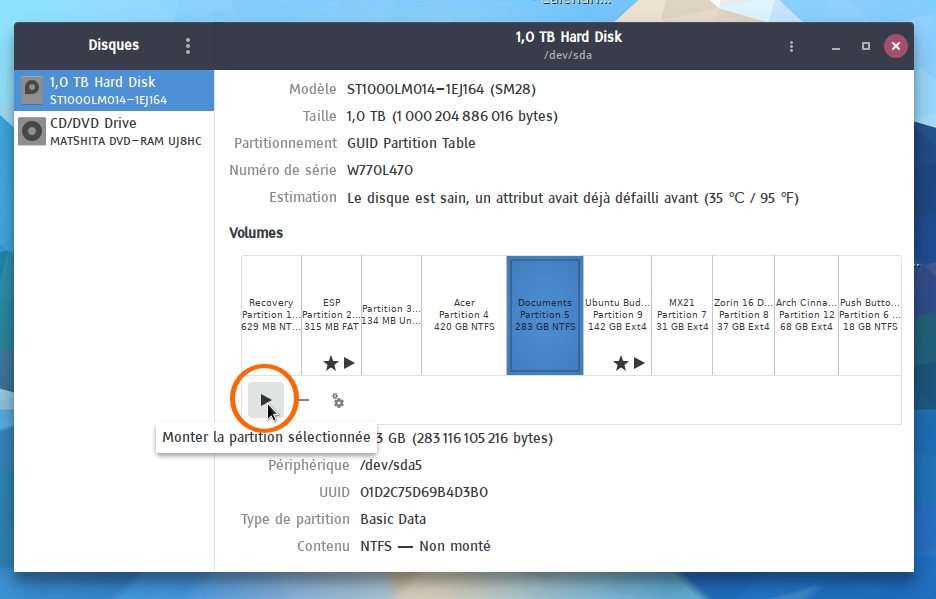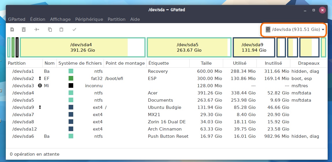 Le problème, avant que je puisse découvrir Zorin plus avant, c'est qu'il ne reconnait pas ma partition de disque qui contient mes données, et j'ai pas envie de rebooter sous W10 à longueur de temps alors je veux commencer par régler ça. Mon disque dur fait donc 1To et était partitionné en 2 pour windows, 200 Go pour C: avec windows et 800 pour D: avec mes données. A l'install de Zorin j'ai mal compris le principe de l'assistant et il m'a divisé ma partition C: alors que je voulais diviser la D: ... mais c'est pas très grave.