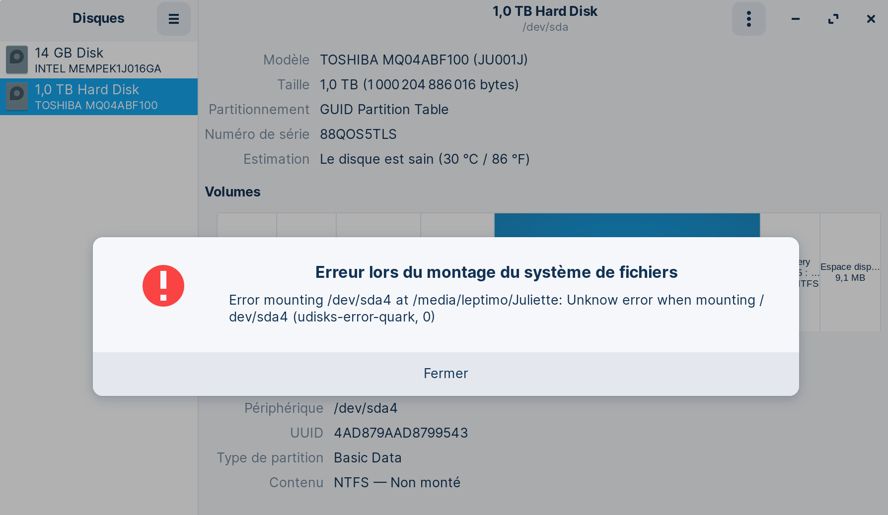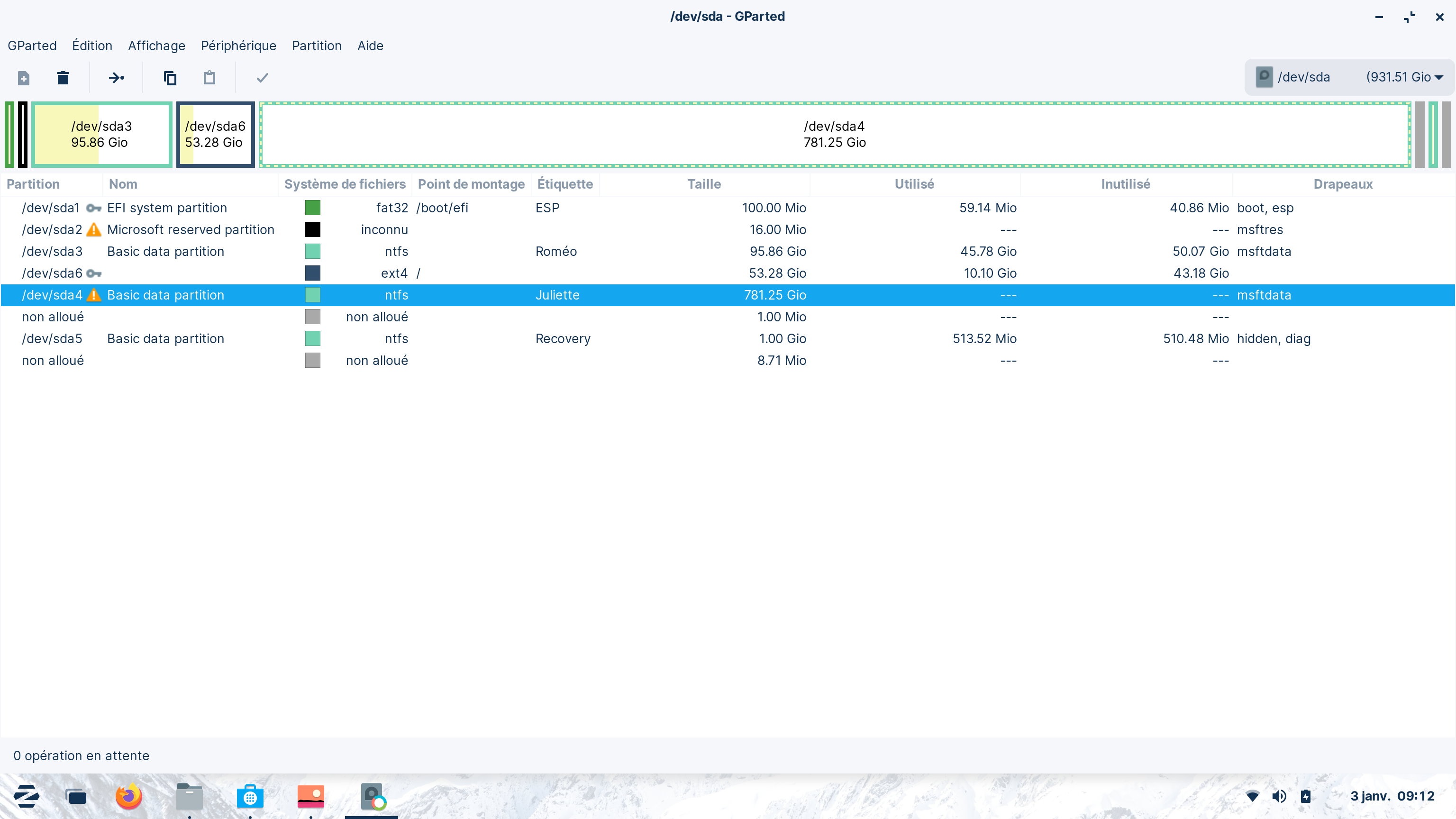 J'ai maintenant 3 partitions principales, 1 de 55 Go pour zorin, C: 100 Go pour W10 et D: 800 Go pour mes données. C: et D: sont en NTFS. Sous windows pas de problème, mais Zorin lui n'arrive pas à ouvrir la partition D: ( error mounting/dev/sda4...) cette erreur n'est pas précisée (unknown). Je ne peux donc pas accéder à mes données sous Zorin!