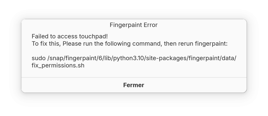 sudo /snap/fingerpaint/6/lib/python3.10/site-packages/fingerpaint/data/fix_permissions.sh